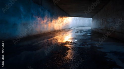 © Thares2020, Fototapeta premium A wet concrete tunnel passage with colorful light reflections on the damp ground