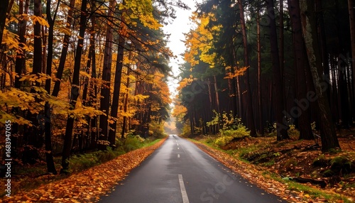 Obraz premium A wet road carves through a forest, flanked by autumn-hued trees, leading...