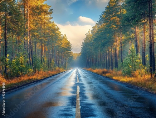 Obraz premium A Wet Road Through Autumnal Forest A solitary road stretches into the...