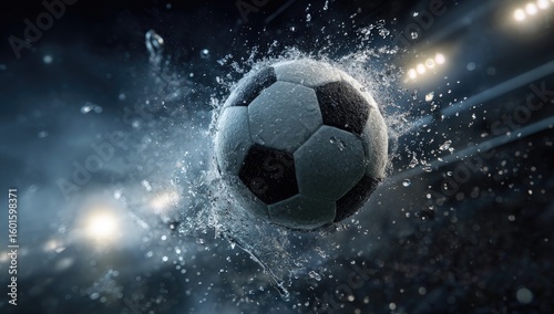 Fototapeta premium A wet soccer ball in mid-air, surrounded by splashing water, set against a blurred stadium background with bright lights (1)