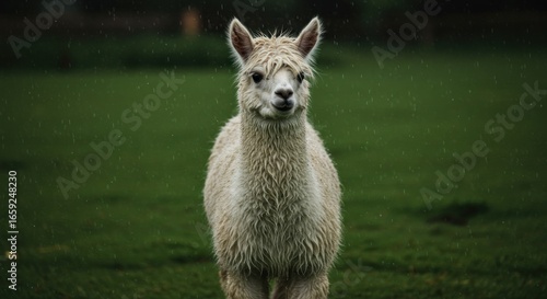 © Erisna Yolanda, Fototapeta premium A wet, white alpaca stands in a verdant field, rain gently falling, its soft fur slightly matted, gazing directly at the camera with a curious expression