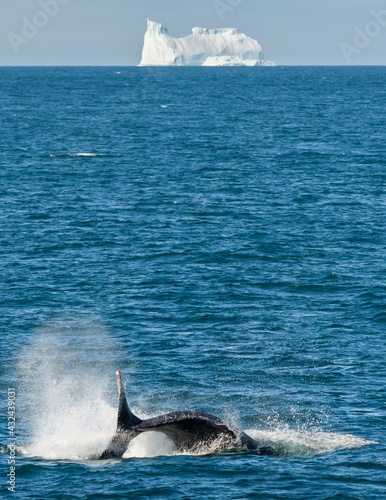 Fototapeta premium A whale breaches near an Antarctic iceberg.