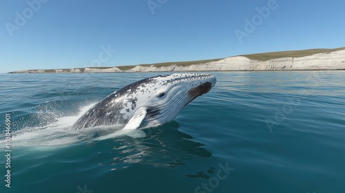 © julio, Fototapeta premium A whale breaching the surface near a coastal landscape.