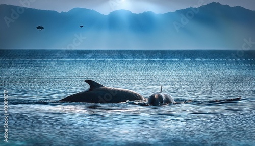 Fototapeta premium A whale calf swimming closely beside its mother, their bodies creating gentle...