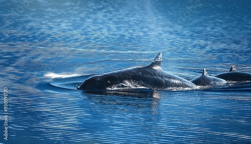 Fototapeta premium A whale calf swimming closely beside its mother, their bodies creating gentle...