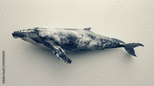© Людмила Мазур, Obraz premium A whale is shown in a white background with a blue and white color scheme. The whale is large and has a unique pattern on its skin. Concept of awe and wonder at the beauty of nature