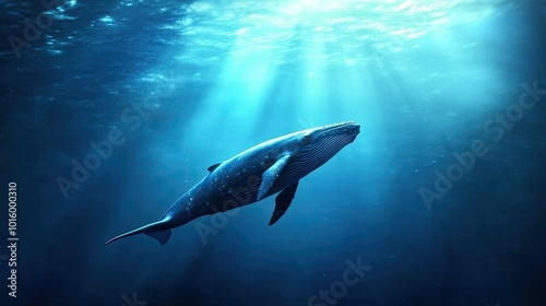 © 96, Fototapeta premium A whale swimming gracefully through the ocean depths. Copy space available in the water.