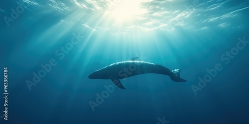 © Blue Harvest Stock, Fototapeta premium A whale swimming under the ocean with sunlight shafts making their way in the water