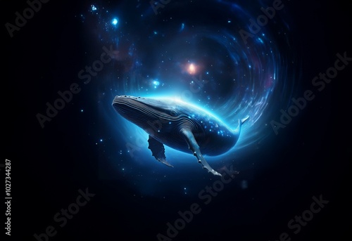 Fototapeta premium A whale swims through a starry, swirling galaxy with an ethereal glow.