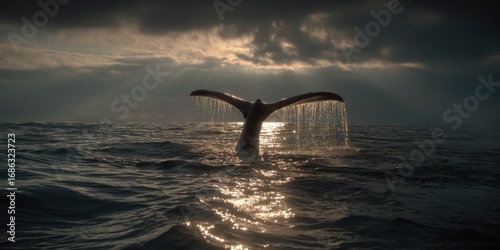 Fototapeta premium A whale tail splashes water against a dramatic, moody sky over the ocean...