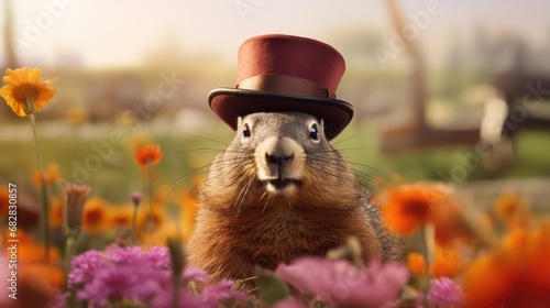 Obraz premium a whimsical and charming portrait featuring a groundhog adorned with a hat