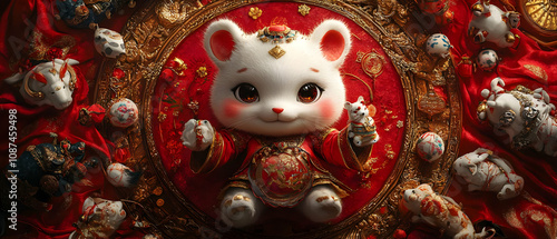 © wannee, Fototapeta premium A whimsical and colorful depiction of a cute, cartoonish mouse surrounded by traditional symbols of celebration.