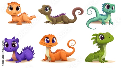 Obraz premium A whimsical assortment of cartoon lizards in dynamic climbing and resting...