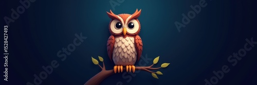 Fototapeta premium A whimsical cartoon owl perched on a branch against a dark blue background,...