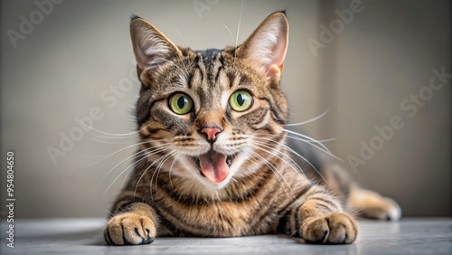 © Caitlin, Naklejka premium A whimsical cat with a goofy grin and flailing limbs, caught in the act of knocking over a
