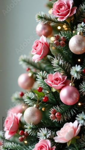 Fototapeta premium A whimsical Christmas tree adorned with pink and white flowers, berries, and ribbons, ribbons, ornaments