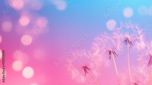 Naklejka premium A whimsical close-up of dandelions against a dreamy pink and blue background, featuring soft bokeh highlights.