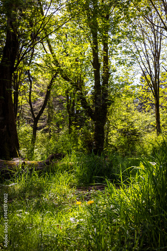 © Samantha, Naklejka premium A whimsical corner of Lincoln Park in Seattle with tall grass, fallen trees and shade with sunlight beaming through. A lovely background.