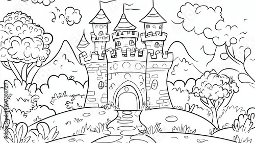 Naklejka premium A whimsical fairy tale castle surrounded by lush greenery and rolling hills under a bright, sunny sky in a magical land, coloring page