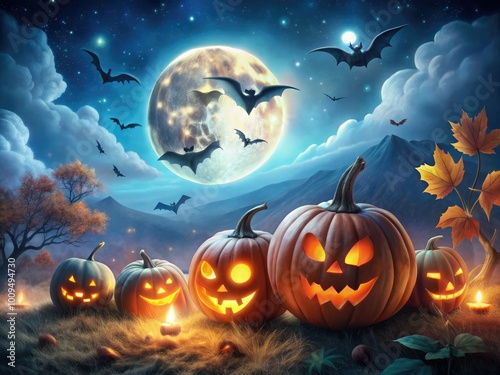 Fototapeta premium A whimsical Halloween scene with grinning pumpkins, playful ghosts, fluttering bats, and an eerie night sky, creating a hauntingly delightful festive atmosphere for all.