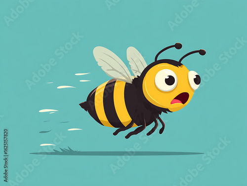 © nirabs_creative, Obraz premium A whimsical illustration captures a cartoon bee in mid-flight, buzzing with a comical expression and dynamic energy against a clean blue backdrop.