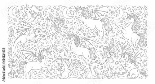 Fototapeta premium A whimsical illustration featuring various mythical creatures, including unicorns, dragons, and fairies, amidst stars and moons.