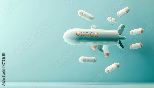 Fototapeta premium A whimsical illustration of a capsule-shaped aircraft surrounded by smaller capsules, set against a soft blue background.