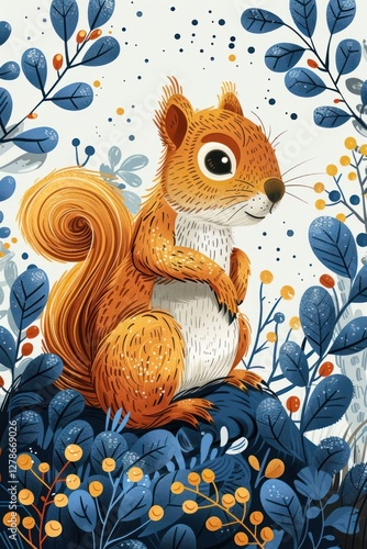 © Tina, Fototapeta premium A whimsical illustration of a squirrel surrounded by colorful foliage.