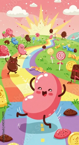 Naklejka premium A whimsical journey down a rainbow candy road, filled with joyful jellybeans and assorted sweets, a vibrant and delightful illustration.