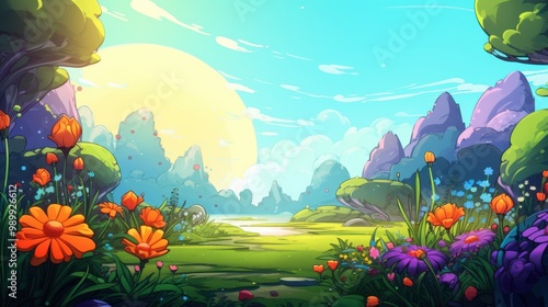 Fototapeta premium A whimsical landscape with colorful flowers and a bright sky