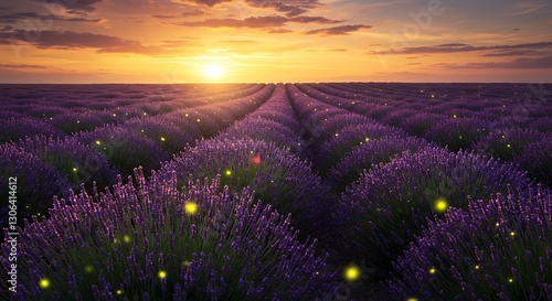 © hattaarshavin, Naklejka premium A whimsical lavender field under a golden sunset with fireflies glowing