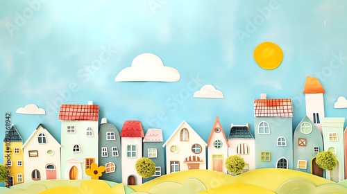 Naklejka premium A whimsical paper craft scene of a town with colorful houses under a blue sky.