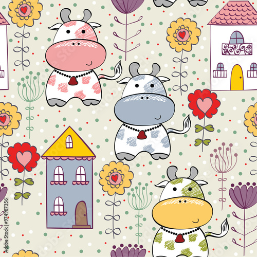© nelson, Fototapeta premium A whimsical pattern featuring cartoon cows and colorful flowers with houses.