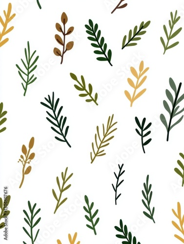 Naklejka premium A whimsical pattern featuring various green and golden leaves on a white...