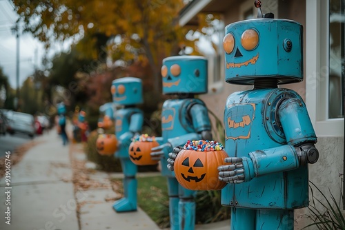 © nuttapong, Obraz premium A whimsical scene of colorful robot decorations holding candy pumpkins, perfect for Halloween festivities and autumn vibes.