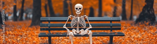 Fototapeta premium A whimsical skeleton relaxing on a bench surrounded by vibrant autumn leaves,...