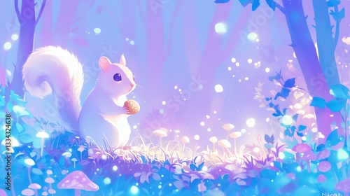 © Suraseak, Obraz premium A whimsical squirrel surrounded by vibrant flora in a magical forest landscape.