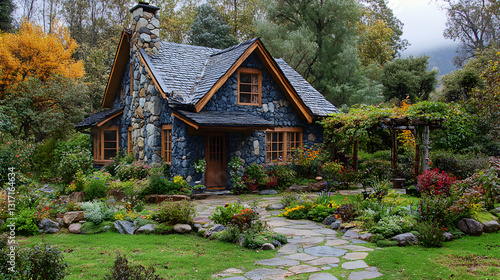 Fototapeta premium A whimsical stone cottage with a wooden roof and lush garden, reminiscent of...