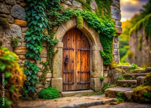 Fototapeta premium A whimsical tilt-shift photo: miniature wooden door set in ancient stone...