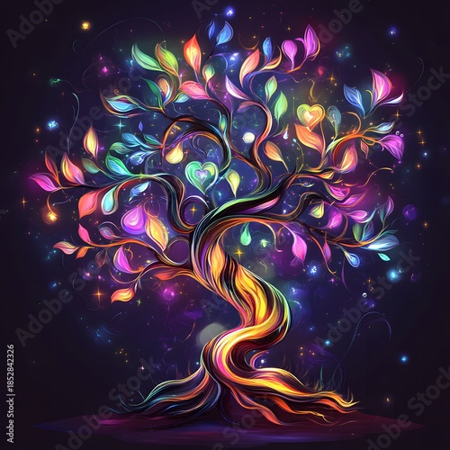 © Sagar, Obraz premium A whimsical tree with rainbow leaves and twinkling stars in the background.
