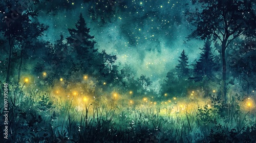 © Junior, Naklejka premium A whimsical watercolor forest clearing under a starlit sky, with glowing fireflies scattered among the tall grass. The soft greens and blues create a serene and magical ambiance. The composition