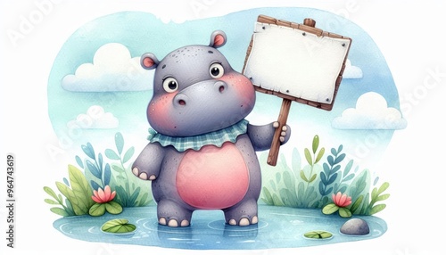 Obraz premium A whimsical watercolor illustration of a friendly hippopotamus standing in a pond. The hippo is holding a blank sign, perfect for adding your own message. This illustration is full of charm and perfec