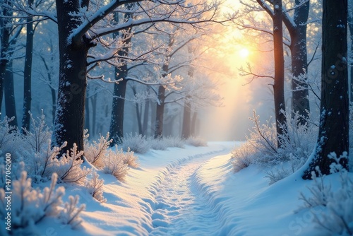 © Prasert, Naklejka premium A whimsical winter scene in a snow-covered forest, with frosted trees and a magical, ethereal glow , fantasy, season, new year