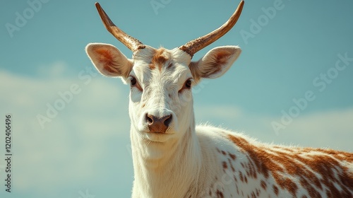 © Tyoma, Obraz premium A white and brown spotted deer with long horns is staring at the camera