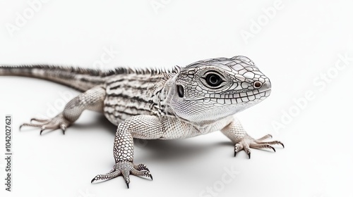 © TI3ee, Naklejka premium A white and gray lizard with black stripes on its back, looking to the right, isolated on a white background.