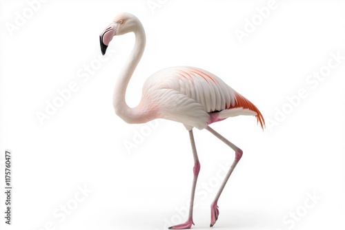 Fototapeta premium A white and pink flamingo is walking on a white background. The flamingo is the main focus of the image, and it is in a relaxed and peaceful state
