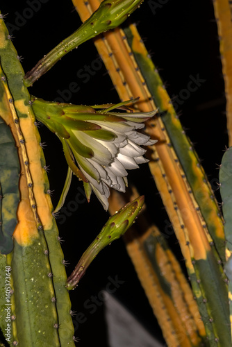 Naklejka premium A white and yellow flower of mandacaru cactus, Cereus jamacaru, blowing at night in Brazil