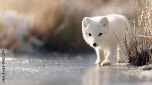 © Anastasiia, Fototapeta premium A white Arctic fox cub walking on ice beside dry grasses in a sunlit winter scene. Concept Arctic fox cub on ice, Sunlit winter landscape, Dry grasses by ice, White fur in sunlight