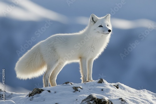 © Nico, Obraz premium A White Arctic Fox Standing on a Snowy Mountain Peak