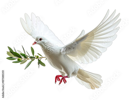 © Abdul, Obraz premium A white bird with spread wings carrying a branch with green leaves